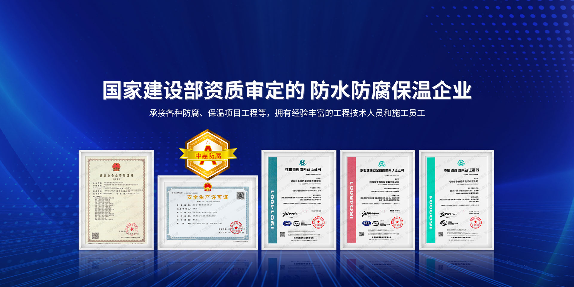 公司經營范圍:防水防腐保溫工程;消防設施工程;建筑裝修裝飾工程;建筑機電安裝工程;電力工程;建筑工程;石油化工工程;工業清洗工程;油罐清洗工程;鋼結構工程;環保工程;模板腳手架工程;電纜防火封堵、防污閃噴涂、外墻外保溫工程;各類施工勞務作業;設備維修、船舶鉚焊、涂裝;電力工程材料、建材、防水材料、防火材料、防腐保溫材料銷售,并相繼通過了GB/T19001-2008idtISO9001:2008GB/T50430-2007質量管理體系認證證書。GB/T24001-2004idtISO14001:2004環境管理體系認證證書。GB/T28001-2011idtOHSAS18001:2007職業健康安全管理體系認證證書。公司是中國防腐蝕于防護協會、中國施工企業管理協會、電力協會和中國鋼結構防水協會會員單位。 公司的經營業務涵蓋了石油、化工、電力、冶金、煤炭、船舶、國防、燃氣、水利、環保、交通運輸、航空及國防軍工和輕紡市政等行業的防腐保溫絕熱設備。鋼結構安裝、防火、防水、金屬噴鍍、聚脲噴繪、陰極保護、防滲透堵漏、玻璃鋼及各種磚版材料襯里、橡膠襯里、煙氣硫和耐酸溶劑腐蝕等工程施工。公司連續十年榮獲“省市先進施工企業”“安全生產先進單位”“重合同,守信用企業”和“AA***資質企業”的稱號。2000年被命名為市級文明單位,2002年被國家工商行政管理局命名為“重合同,守信用的企業”、被中國工業防腐蝕技術協會命名為“防腐蝕企業,能源節約及環境保護領域有豐富的經驗和***的業績。工程一次交驗合格率100%。其中攀枝花鋼鐵公司煉鐵廠四號高爐及熱風爐防腐工程、上海寶鋼公司煤氣柜防腐工程、撫順石油一廠裝置防腐項目、齊魯石化公司稀烴廠高塔防腐工程、吉林化學工業公司煉油廠油罐防腐工程、天津石化熱電廠六號爐頂棚聯絡管保溫工程、大慶油田(太倉)力神泵業工程、中國化學工程第十一建設工程、中原油田勘探局工程、中國石化銷售有限公司華北分部、魯皖輸油管道工程、貴州開磷息烽合成氨工程、陜西黃陵煤化工程、中國石油天然氣西部管道塔里木輸油工程、邯鋼集團邯寶鋼鐵公司煉鐵工程、德州供電工程、吉寶(南通)船廠工程,偃師華潤熱力工程、鄭州熱力總公司。 河南省中惠防腐安裝有限公司愿以豐富的施工經驗,***的技術,***的設備,***的管理,***的服務,竭誠為國內外廣大的用戶提供***滿意、******的工程作品。 我公司愿與國內外同仁一道,團結協作,共同推進防腐蝕行業發展! 公司地址:河南省長垣縣建設路北段360號 固定電話:0373-8866488 郵編:453400 網址:http://www_hbd100_cn.823jm.com